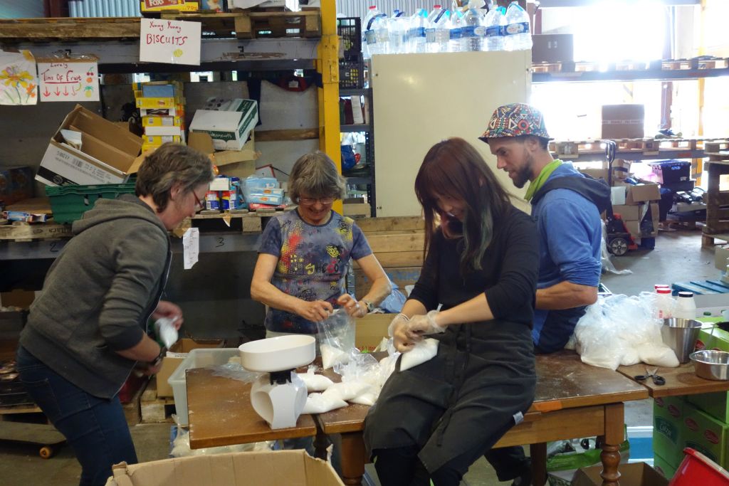 Préparation des sacs individuels d'épicerie sèche pour les migrants de la Jungle