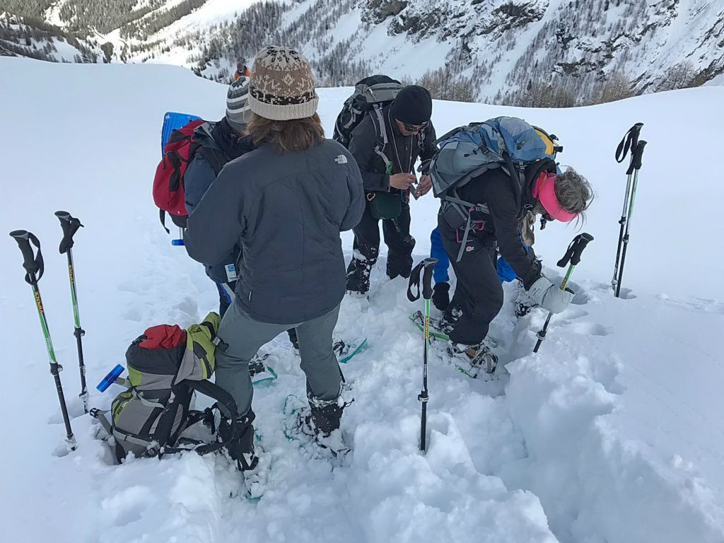Après une 1ère casse à la montée, l'attache de la raquette gauche d'Annie se casse. Autre réparation de fortune! (Merci Elodie pour la photo)